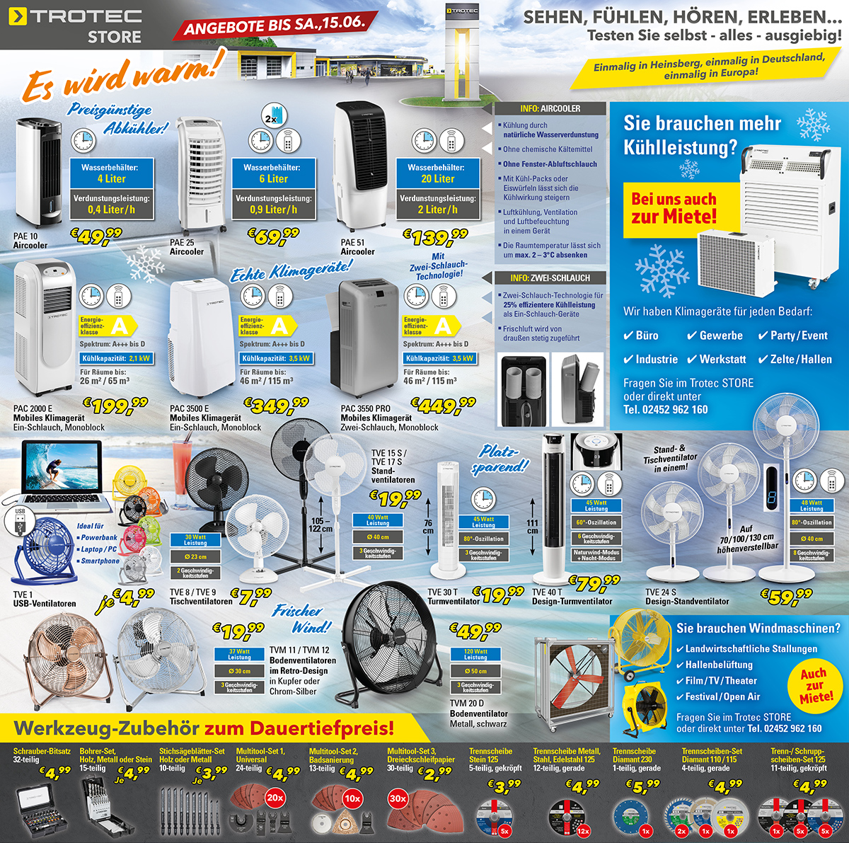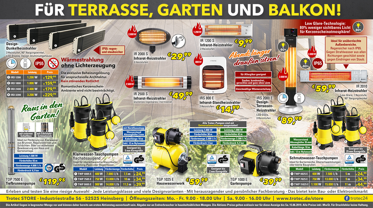 Die Angebotspreise sind bis Samstag, 15.06.2019 im Trotec STORE gültig. Aber auch in unserem Trotec OUTLET gibt es wieder interessante Schnäppchen!