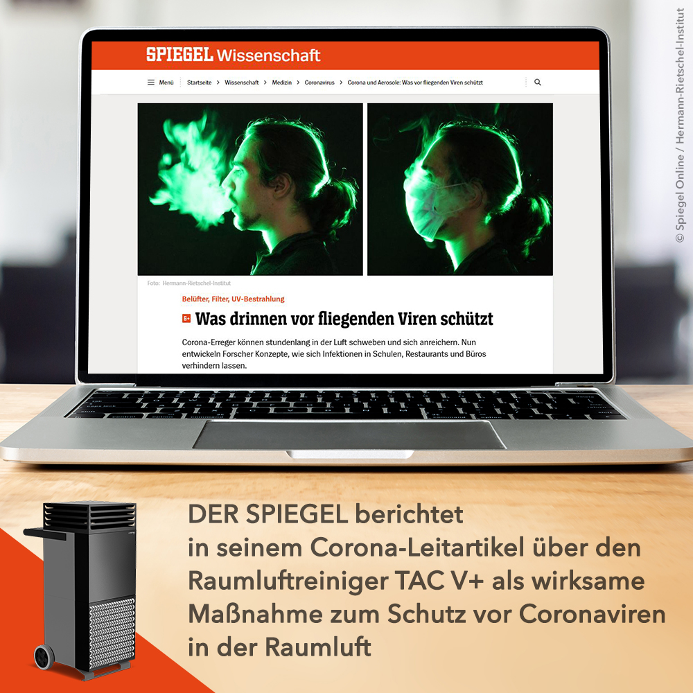 Das Nachrichtenmagazin DER SPIEGEL berichtet in seiner Heftausgabe Nr. 33 sowie im Onlineportal SPON über „Fliegende Viren“ in der Raumluft und wie sich das Corona-Ansteckungsrisiko durch den Einsatz des Luftreinigers TAC V+ von Trotec reduzieren lässt. In der Öffentlichkeit, beim Einkaufen – aber insbesondere in den gerade wieder eröffneten Schulen, in der krisengebeutelten Gastronomie und natürlich in den zahlreichen Großraumbüros, die unsere Wirtschaft und das kommunale Leben in Bewegung halten.