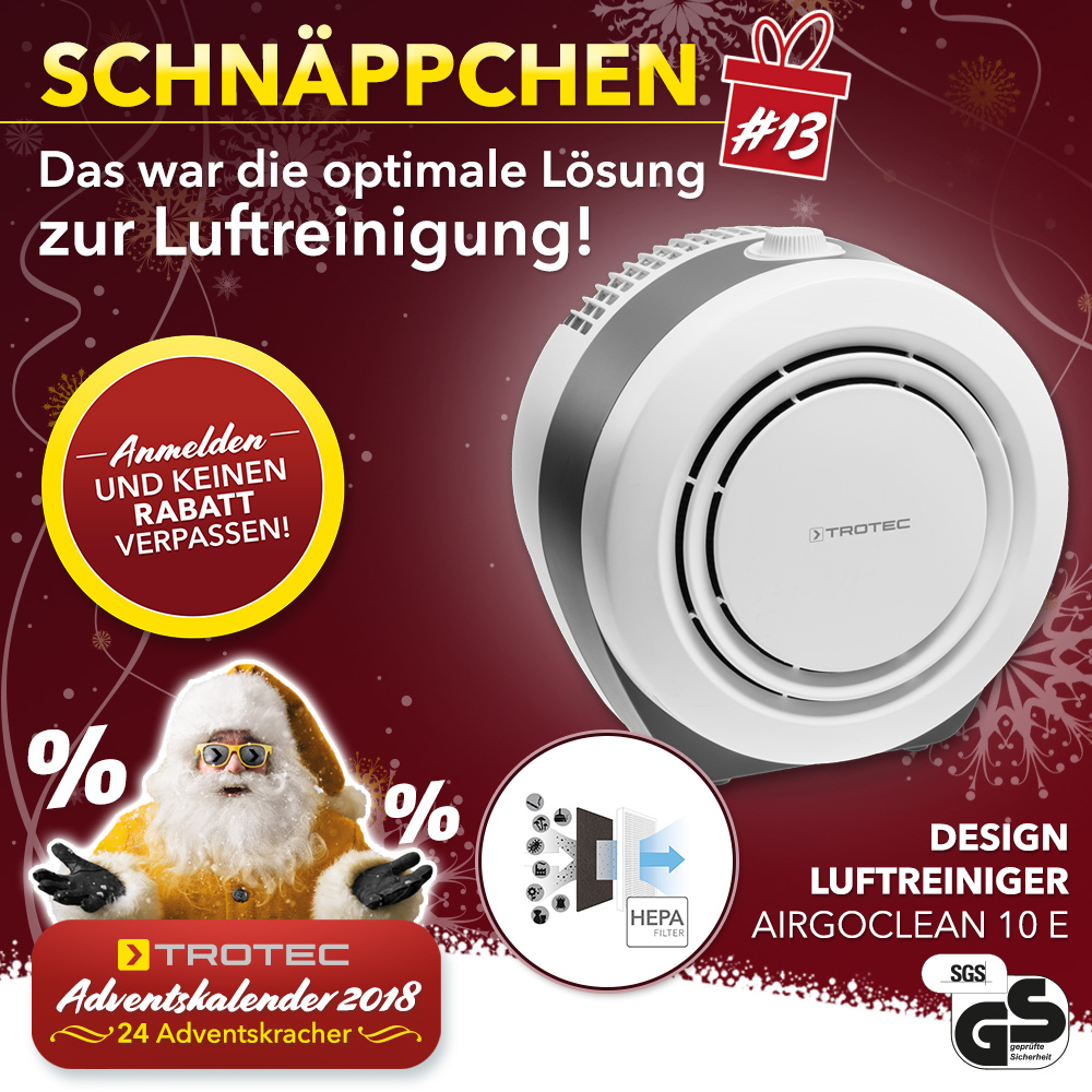 Bei unserem heutigen Adventskalender-Angebot hieß es ‚Frischluft einschalten – Schadstoffe ausschalten‘ mit dem Design-Luftreiniger AirgoClean 10 E. Bis zum 24. Dezember erhalten Sie jeden Tag per E-Mail ein besonderes Aktionsangebot.