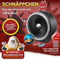 Mit unserem heutigen Adventskracher hätten Sie für schnelle Wärme im Winter und erfrischende Abkühlung im Sommer gesorgt. Unseren 2-in-1-Heizlüfter und Ventilator TFH 2000 E gab es 61 % günstiger mit dem Rabatt-Code aus dem heutigen Newsletter!