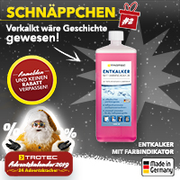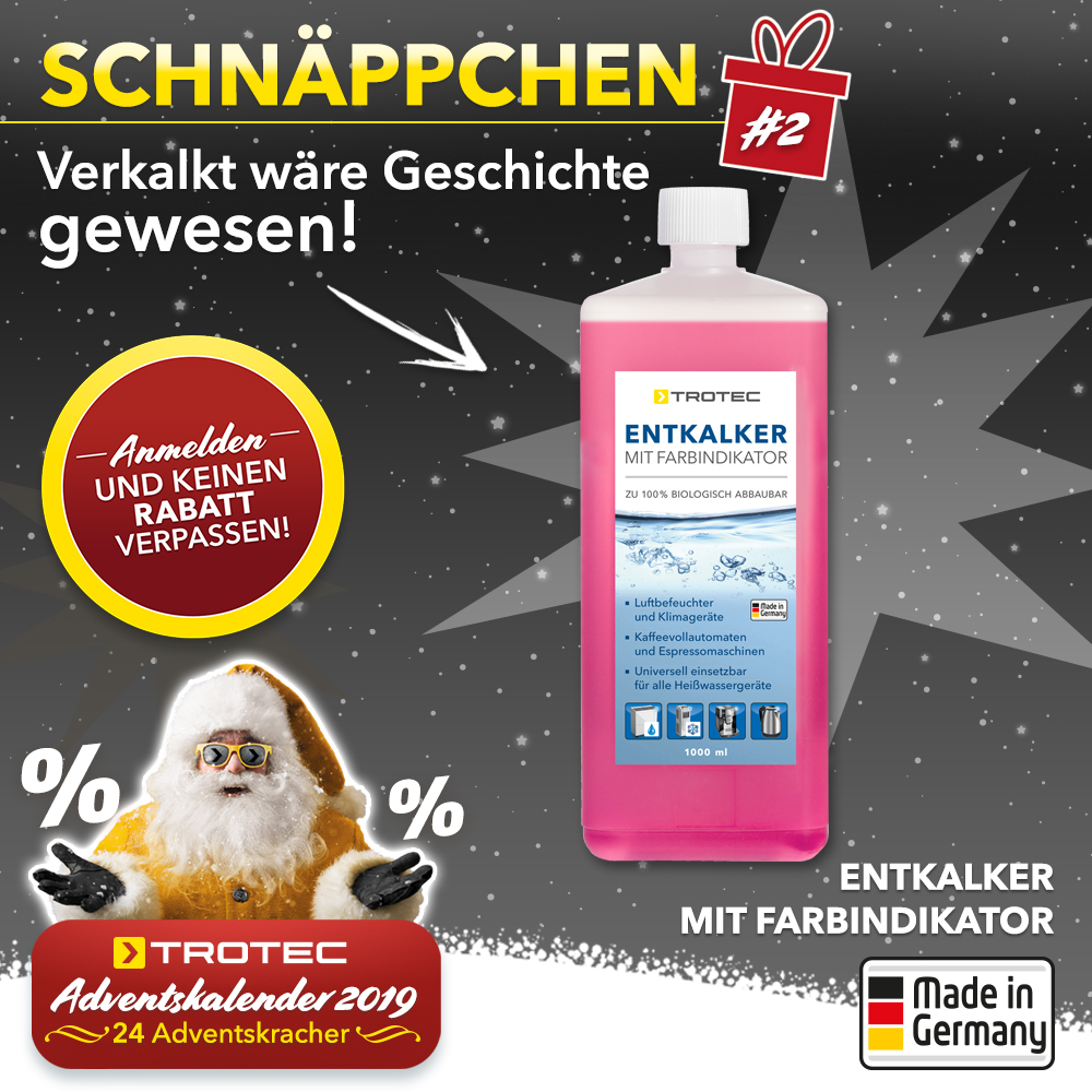 Unser heutiger Adventskracher war der universell einsetzbare Entkalker mit Farbindikator ganze 70 % günstiger mit unserem Rabatt-Code. Um interessante Sparangebote per E-Mail zu erhalten, melden Sie sich zum Trotec-Adventskalender an. Bis zum 24. Dezember sind noch viele Überraschungen für Sie drin!