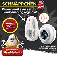 Mit unserem heutigen Adventskracher hätten Sie ganz einfach per Fernsteuerung bestimmen können, bei welcher Raumtemperatur elektrische Heizgeräte oder Klimaanlagen an- oder abgeschaltet werden. Unser Funk-Thermostat mit Zeitschaltuhr BN35 gab es 53 % günstiger mit dem Rabatt-Code aus dem heutigen Newsletter!