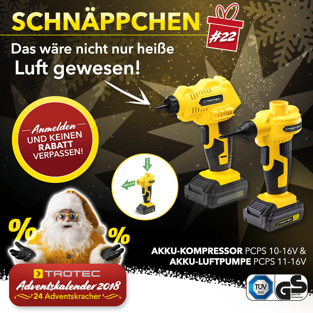 Unser heutiger Adventskracher war der Akku-Kompressor mit der Akku-Luftpumpe PCPS 10/11‑16V. Das Schnäppchen gab es nicht nur günstig, es wäre auch ein praktisches Komplett-Set für die Luftbefüllung und Luftabsaugung gewesen.