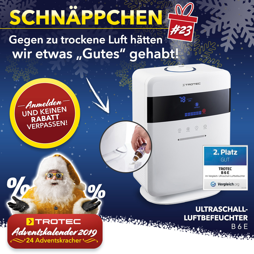 Mit unserem heutigen Adventskracher hätten Sie Erkältungen und Reizhusten vorbeugen können. Unseren Ultraschall-Luftbefeuchter B 6 E gab es 58 % günstiger mit dem Rabatt-Code aus dem heutigen Newsletter!