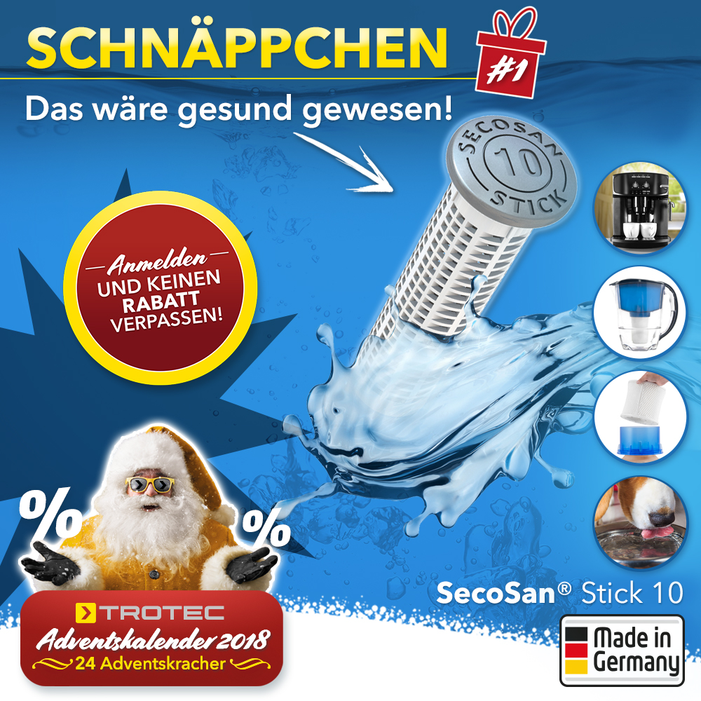 Heute war es soweit: Endlich konnte man die erste Mail im Postfach öffnen. Als erstes Advents-Schnäppchen gab es den SecoSan® Stick 10. Doch das war erst der Anfang. Jetzt schnell zum Trotec-Newsletter anmelden und bis Heiligabend noch 23 weitere Kracher-Angebote erhalten! Hier geht es zur Anmeldung: https://de.trotec.com/adventskalender