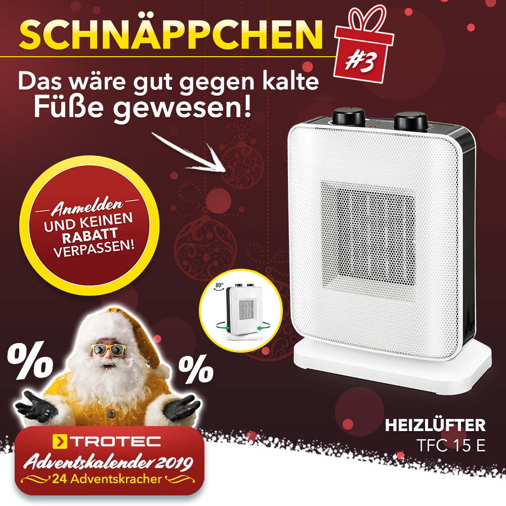 Heute gab es in unserem Adventskalender die Chance den Heizlüfter TFC 15 E besonders günstig zu ergattern, Sie hätten tatsächlich 69 % sparen können. Sind Sie noch nicht im E-Mail-Verteiler? Dann wird es aber Zeit. Jetzt schnell zu unserem Adventskalender anmelden und schon ab morgen kräftig sparen!