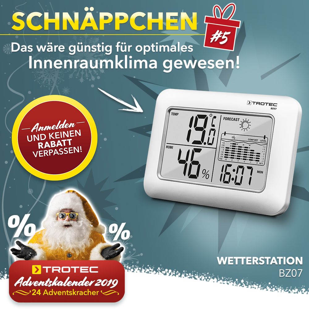 Unser heutiger Adventskracher war die praktische Wetterstation BZ07! Unseren Innenraum-Klimamonitor gab es 66 % günstiger mit dem Rabatt-Code aus dem heutigen Newsletter!