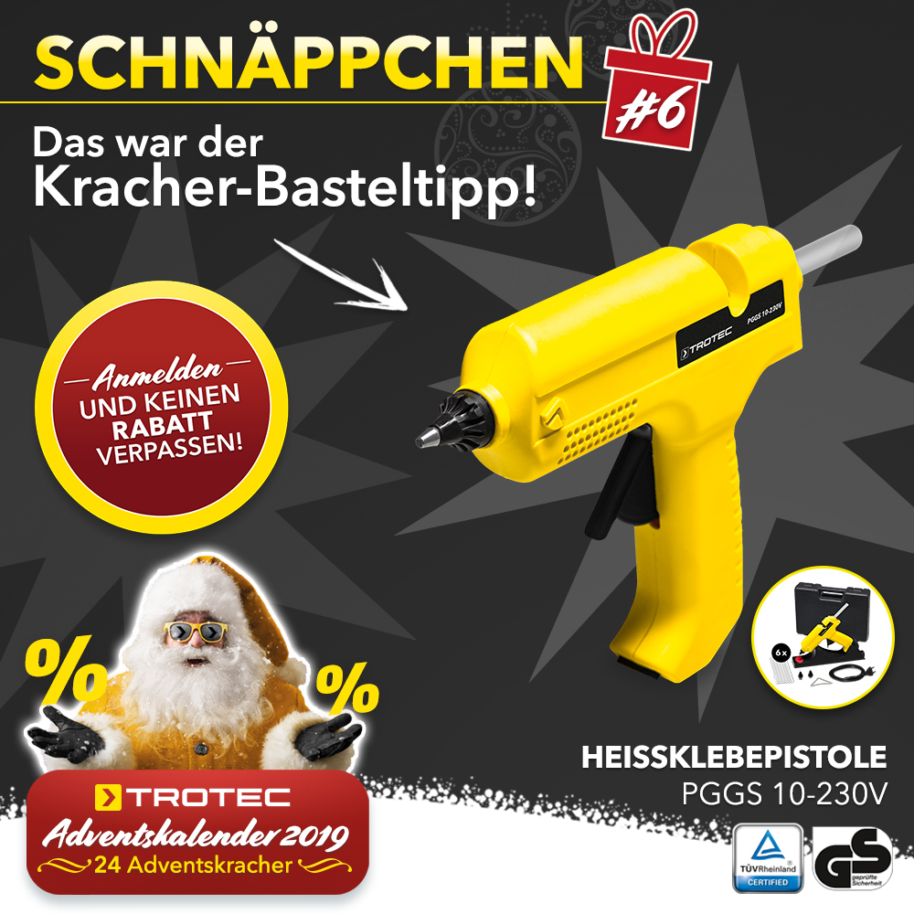 Unser heutiger Adventskracher war die handliche Heissklebepistole PGGS 10-230V! Die professionelle Lösung für nahezu jede Befestigungsaufgabe gab es 59 % günstiger mit dem Rabatt-Code aus dem heutigen Newsletter!