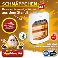 Unser heutiger Adventskracher war der Sonnenschein IRS 800 E – unseren Infrarot Standheizstrahler gab es 67 % günstiger mit dem Rabatt-Code aus dem heutigen Newsletter!