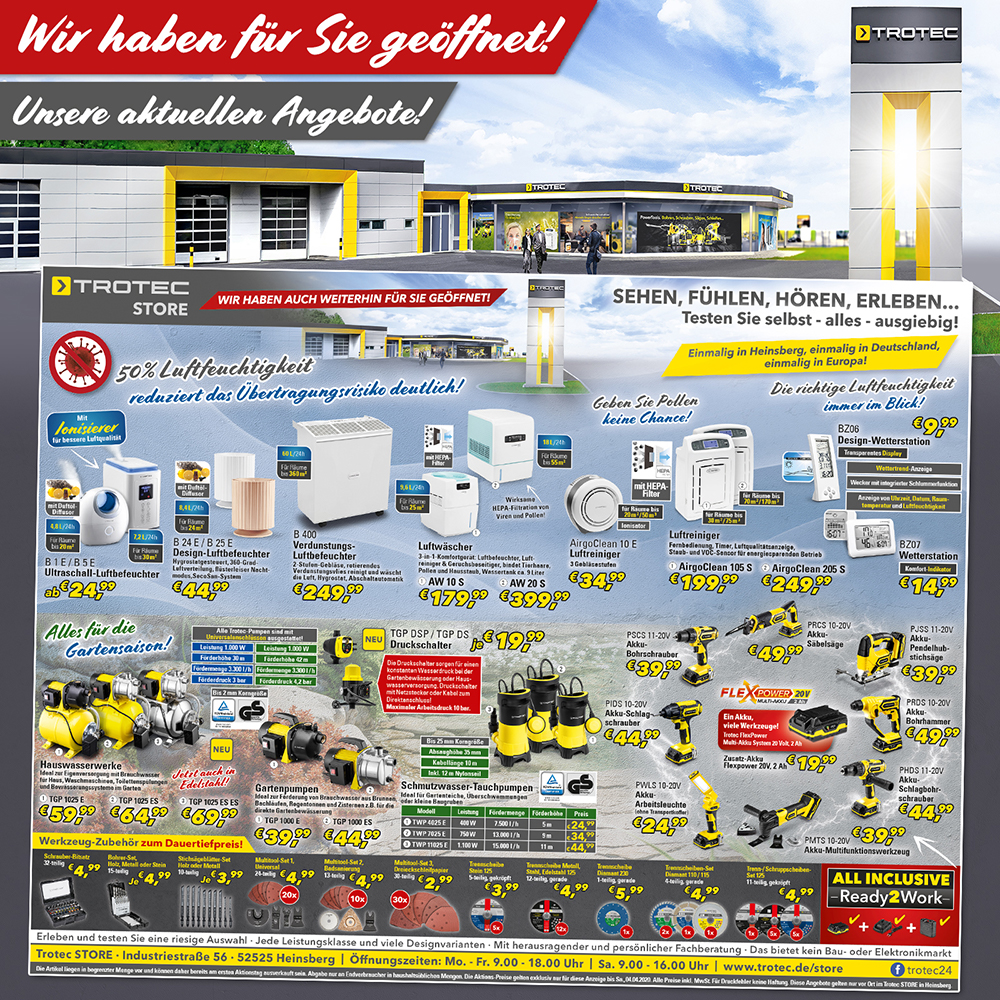 *Die Artikel liegen in begrenzter Menge vor und können daher bereits am ersten Aktionstag ausverkauft sein. Abgabe nur an Endverbraucher in haushaltsüblichen Mengen. Die Aktions-Preise im STORE gelten exklusiv nur für diesen Newsletter bis Sa., 04.04.2020 und sind nur bei Trotec vor Ort in Heinsberg gültig.