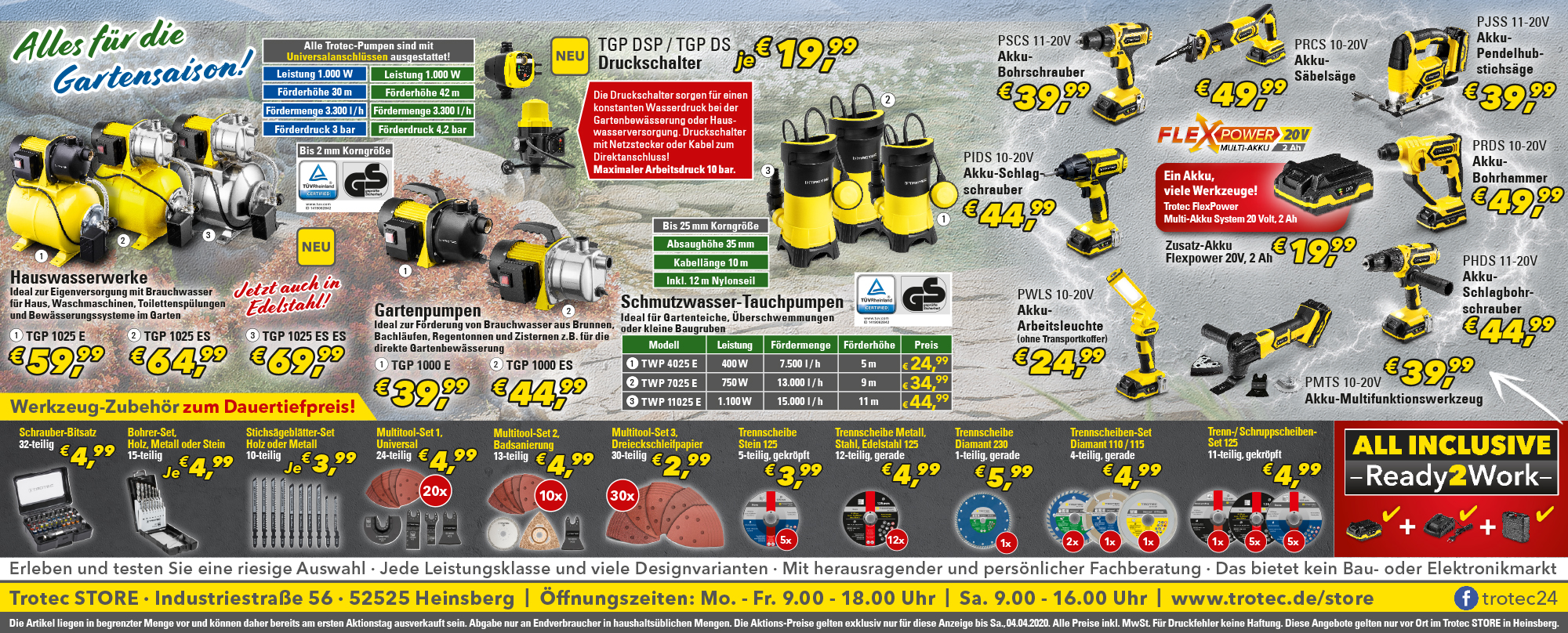 Weil man sich nun sehr viel Zuhause aufhält, ergibt sich die Gelegenheit für Gartenarbeiten oder Heimwerker-Projekte. Im Trotec STORE finden Sie die passenden Pumpen und Powertools! Auch praktisches Werkzeugzubehör ist bei uns zum Dauertiefpreis zu bekommen.