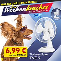 Die Sonne knallt… Abkühlung gefällig? Machen Sie doch mal richtig Wind mit unserem neuen Wochenkracher! Mit dem Tischventilator TVE 9 schaffen Sie an heißen Tagen, ohne Montageaufwand, eine kostengünstige Abkühlung am Arbeitsplatz oder im privaten Wohnraum. Einfach das Gerät aufstellen, das Netzkabel einstecken und die erfrischende Kühle auf der Haut spüren. Holen Sie sich das luftige Schnäppchen bis Freitag, 06. Juli in unserem Werksverkauf in Heinsberg.