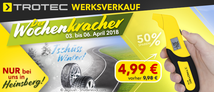 Passend zum anstehenden Reifenwechsel, zur ersten Frühjahrstour mit dem Fahrrad oder für alle Motorradfahrer: Holen Sie sich das Trotec Reifendruck-Messgerät BY10 in unserem Werksverkauf. Das Angebot ist von Dienstag, 03. bis Freitag, 06. April gültig und nur in unserem Store in Heinsberg-Oberbruch erhältlich. Sichern Sie sich jede Woche einen neuen, ausgewählten Preiskracher in unserem Werksverkauf – vorbeikommen und von tollen Rabatten profitieren!