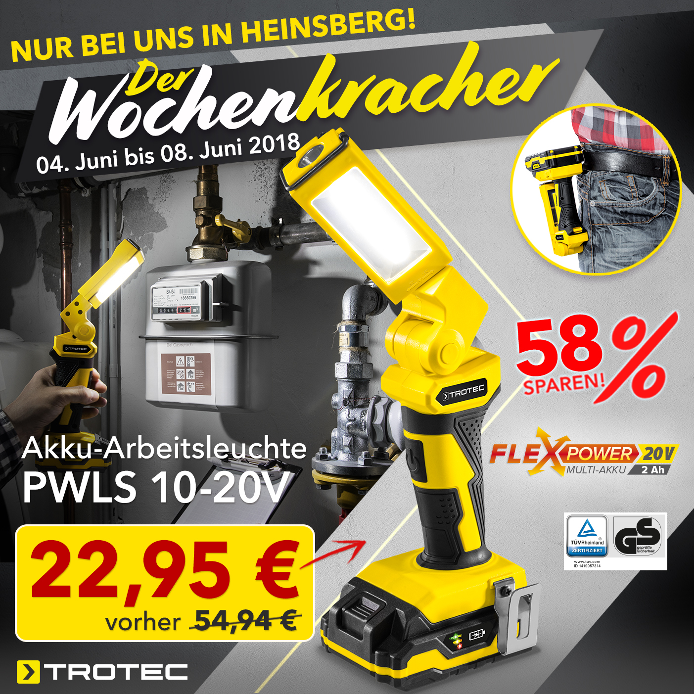 Jede Woche ein Preiskracher – nur bei uns vor Ort im Trotec Werksverkauf in Heinsberg! Diesmal für alle, die sicher arbeiten und nicht länger im Dunkeln tappen wollen. Ob in Werkstatt und Garage, unterm Fahrzeug, im Keller, Neubau oder Gartenhaus – die Akku-Arbeitsleuchte PWLS 10-20V sorgt selbst an schwer zugänglichen Arbeitsplätzen für helles Licht (300 Lumen / 110 Lux).
