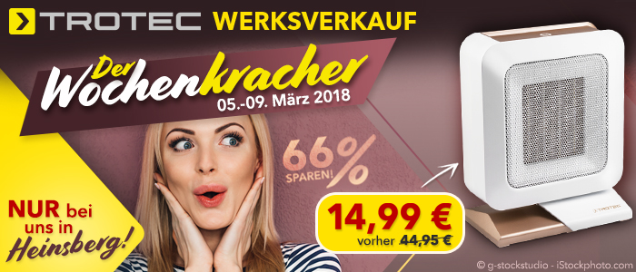 Holen Sie sich den „Trotec-Wochenkracher“. Das Angebot ist von Montag, 05. bis Freitag, 09. März gültig und nur in unserem Store in Heinsberg-Oberbruch erhältlich. Ab jetzt bieten wir Ihnen jede Woche einen ausgewählten Preiskracher in unserem Werksverkauf an – vorbeikommen lohnt sich also!