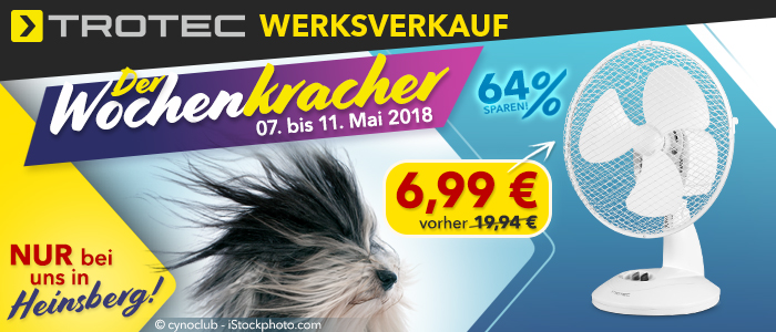 Frühling, Sonne… Abkühlung gefällig? Machen Sie doch mal richtig Wind mit unserem neuen Wochenkracher! Mit dem Tischventilator TVE 9 schaffen Sie an heißen Tagen, ohne Montageaufwand, eine kostengünstige Abkühlung am Arbeitsplatz oder im privaten Wohnraum. Einfach das Gerät aufstellen, das Netzkabel einstecken und die erfrischende Kühle auf der Haut spüren. Holen Sie sich das luftige Schnäppchen bis Freitag, 11. Mai in unserem Werksverkauf in Heinsberg.