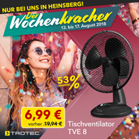 In der Erleichterung über die Abkühlung der letzten Tage, vergisst man schnell, dass die Hitzewelle noch nicht vorbei ist. Deshalb haben wir uns für Euch, als aktuellen Wochenkracher, den Tischventilator TVE 8 überlegt. Viel Wind zum kleinen Preis, ideal für kleine Räume und eine schnelle Erfrischung. Dieses Schnäppchen bekommt ihr bis kommenden Freitag nur bei uns im Store in Heinsberg.