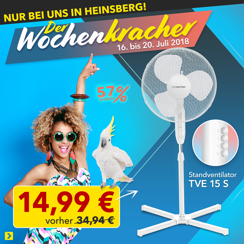 Mit unserem neuen Wochenkracher, dem Standventilator TVE 15 S, können Sie bei den Temperaturen zu Hause, im Büro oder auf der Terrasse mal so richtig Wind machen. Genießen Sie mit dem zeitlosen Standventilator endlich abgekühlt und mit frischer Brise den Sommer!