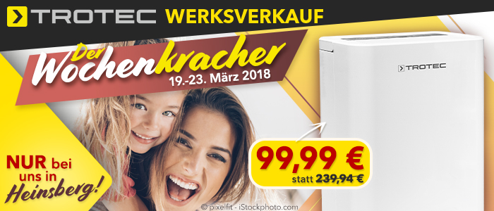 Und weiter geht’s. Kommende Woche gibt es den Komfort-Luftentfeuchter TTK 52 E als Wochenkracher in unserem Werksverkauf. Das Angebot ist von Montag, 19. bis Freitag, 23. März gültig und nur in unserem Store in Heinsberg-Oberbruch erhältlich. Sichern Sie sich jede Woche einen neuen, ausgewählten Preiskracher in unserem Werksverkauf – vorbeikommen und von tollen Rabatten profitieren!