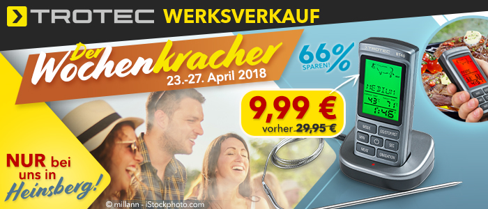 Frühling, Sonne, Wochenkracher… Wahnsinns-Wetter, haben Sie schon gegrillt? Dann wird es aber Zeit. Mit unserem kabellosen Grillthermometer BT40 schlägt das Herz ambitionierter Hobby-Köche höher. Gäste mit perfekt gegartem Fleisch oder auch Fisch verwöhnen, ohne dabei die ganze Zeit am Grill stehen zu müssen? Kein Problem! Holen Sie sich das praktische Schnäppchen bis Freitag, 27. April in unserem Werksverkauf in Heinsberg.