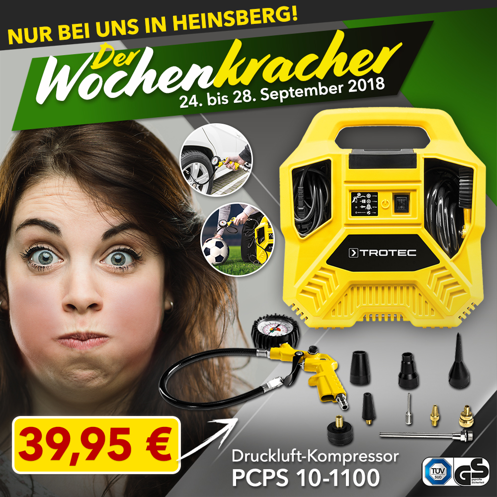 ALL-IN-ONE! Unser neuer Wochenkracher, der Druckluft-Kompressor PCPS 10-1100 zeigt sich von seiner besten Seite mit seinen platzsparenden Verstaumöglichkeiten für Druckluftschlauch, Netzkabel und Zubehör – direkt im Gehäuse. Auch das 9-teilige Adapter-Set für alle gängigen Ventile wird Euch begeistern. Der PCPS 10-1100 ist die ideale Zuhause-Lösung nicht nur für Autoreifen, sondern auch für Motor- oder Fahrräder, Bälle, Luftbetten und vieles mehr. Den Druckluft-Kompressor in der leichten und robusten Koffer-Konstruktion gibt es bis nächsten Freitag, 28.09.2018 zum Aktionspreis NUR bei uns in Heinsberg-Oberbruch.