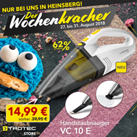 Unser neuer Wochenkracher ist die handliche Lösung gegen jedes Krümelmonster. Mit dem brandneuen VC 10 E Akku-Handstaubsauger gehören Staub, Haare und Kleckereien zu Hause oder im Auto der Vergangenheit an. Für den kleinen Schmutz zwischendurch brauchen Sie kein großes Gerät, unser Handstaubsauger ist schnell zur Hand. Ob Trocken- oder Nasssaugen, beides wird in einem Gerät vereint. Für Allergiker ist der Staubfilter im Handumdrehen ausgewaschen und bereit für die nächste Runde. Dieses Schnäppchen bekommen Sie bis kommenden Freitag, 31. August, nur bei uns im Trotec STORE in Heinsberg-Oberbruch.