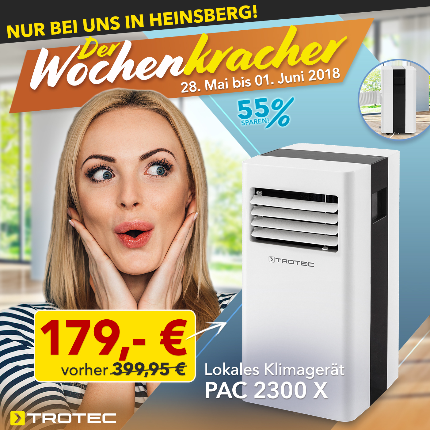 Hier kommt unser neuer Kracher… Für alle, die auch in der allergrößten Hitze einen kühlen Kopf bewahren wollen: Das Klimagerät PAC 2300 X eignet sich mit seiner 2,3 kW starken Leistung sowie der Energieeffizienzklasse A ideal für Wohn- und Büroräume bis zu einer Größe von 30 m². Dank der cleveren Stromsparfunktion ermöglicht das dezent gestylte Klimagerät gegenüber herkömmlichen Konstruktionen einen äußerst ökonomischen Kühlbetrieb! Holt euch das coole Schnäppchen bis Freitag, 01. Juni in unserem Werksverkauf in Heinsberg.