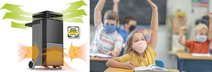 Virenbehaftete Aerosole, die nach einhelliger Meinung der Aerosolforschung für mehr als 99 Prozent aller Corona-Infektionen verantwortlich sind und bei nur unzureichender Lüftung stundenlang in den Klassenräumen umherschweben, entfernen die Hochleistungsluftreiniger mit H14-HEPA-Filtern (zertifiziert nach EN 1822) zu 99,995 % aus der Raumluft. Lediglich 6 bis 15 Minuten benötigt ein TAC V+, um die Virenlast in einem 80 qm großen Bereich zu halbieren. In kleineren Räumen erfolgt die Halbierung sogar schon nach 3 Minuten! Durch den dauerhaften Betrieb mit hohen Luftumwälzungsraten (in etwa das sechsfache Raumvolumen eines Klassenraums) wird die Virenlast im Klassenzimmer dauerhaft auf einem niedrigen Niveau gehalten, womit luftübertragende Infektion mit dem Corona-Virus nahezu ausgeschlossen werden können.