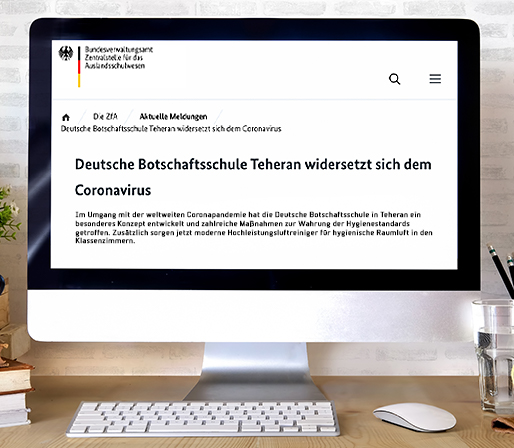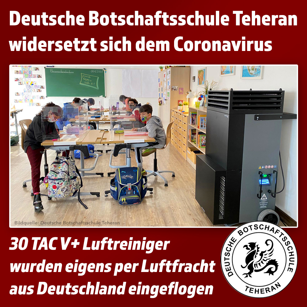 Mit Blick auf die weltweite Coronapandemie hat die Deutsche Botschaftsschule in Teheran ein von Professor Dr. Christian Kähler empfohlenes Hygienekonzept umgesetzt, um Schülerinnen und Schüler sowie das Lehrpersonal bestmöglich vor einer Ansteckung mit dem Coronavirus SARS-CoV-2 zu schützen. Dafür wurden 30 TAC V+ Hochleistungsluftreiniger von Trotec per Luftfracht nach Teheran eingeflogen.