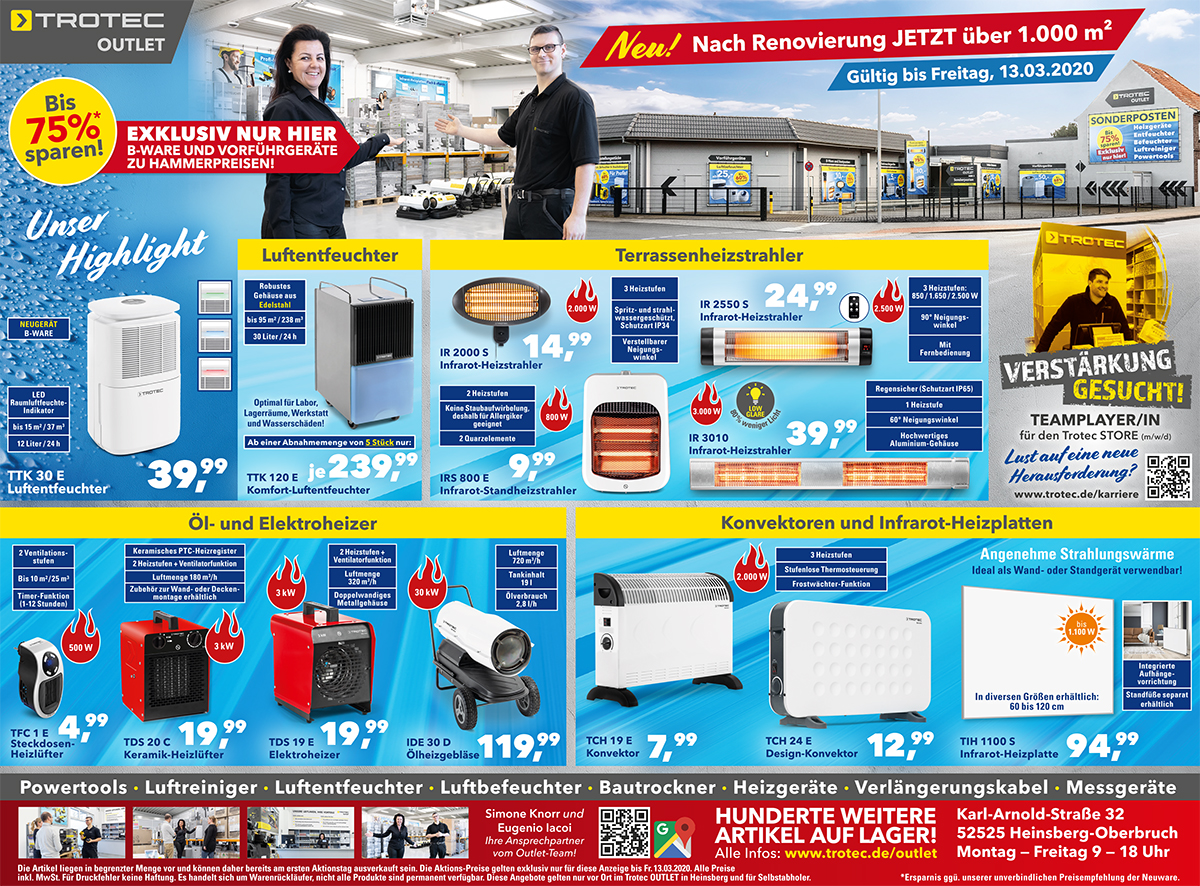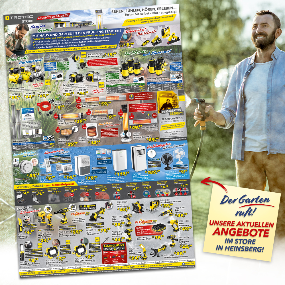 *Die Artikel liegen in begrenzter Menge vor und können daher bereits am ersten Aktionstag ausverkauft sein. Abgabe nur an Endverbraucher in haushaltsüblichen Mengen. Die Aktions-Preise im STORE gelten exklusiv nur für diesen Newsletter bis Sa., 21.03.2020 und sind nur bei Trotec vor Ort in Heinsberg gültig.