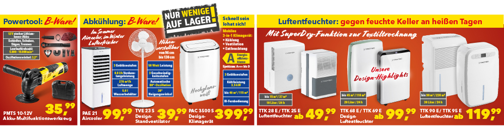 ACHTUNG, nur noch wenige auf Lager: Zur Abkühlung bieten wir Ihnen Aircooler, Ventilatoren und leistungsstarke Klimageräte – bei unseren 3 aktuellen Aktions-Produkten handelt es sich um B-Ware.