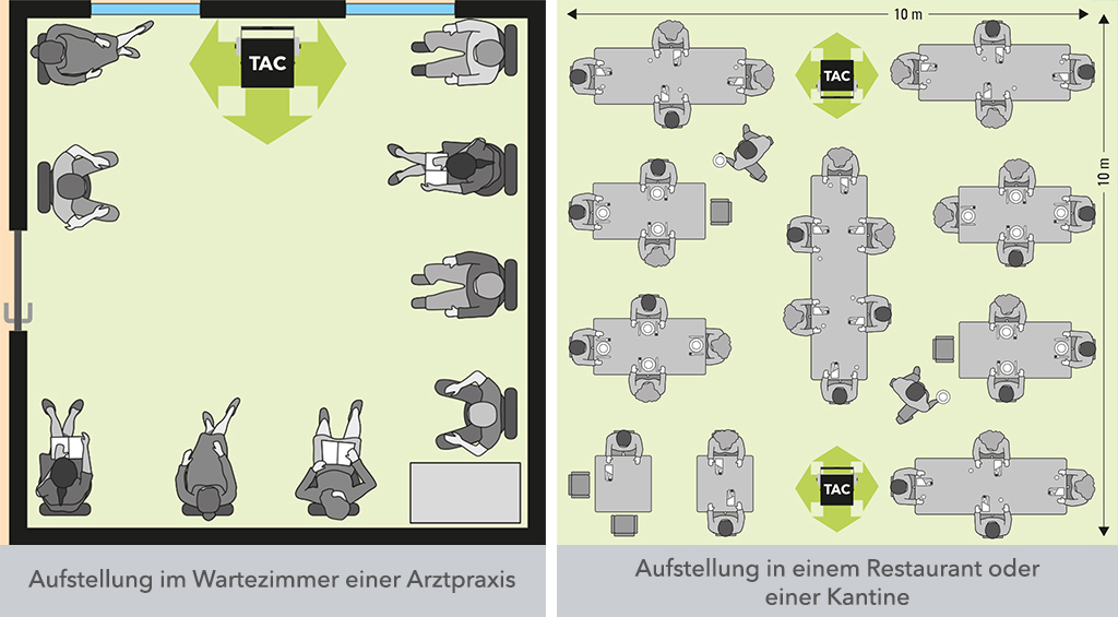 Mit den Hochleistungsluftreinigern der TAC-Serie bietet Trotec professionelle Lösungen für aerosolfrei gefilterte Reinluftqualität in größeren Räumen wie Schulen, Restaurants, Büros, Praxen oder Hotels. Durch die Bereitstellung virengefilterter Reinluft gewährleistet der TAC V+ im gewerblichen Umfeld und in öffentlichen Einrichtungen einen hohen Schutz für Mitarbeiter und Kunden, Lehrende und Schülerschaft, Personal und Patienten.