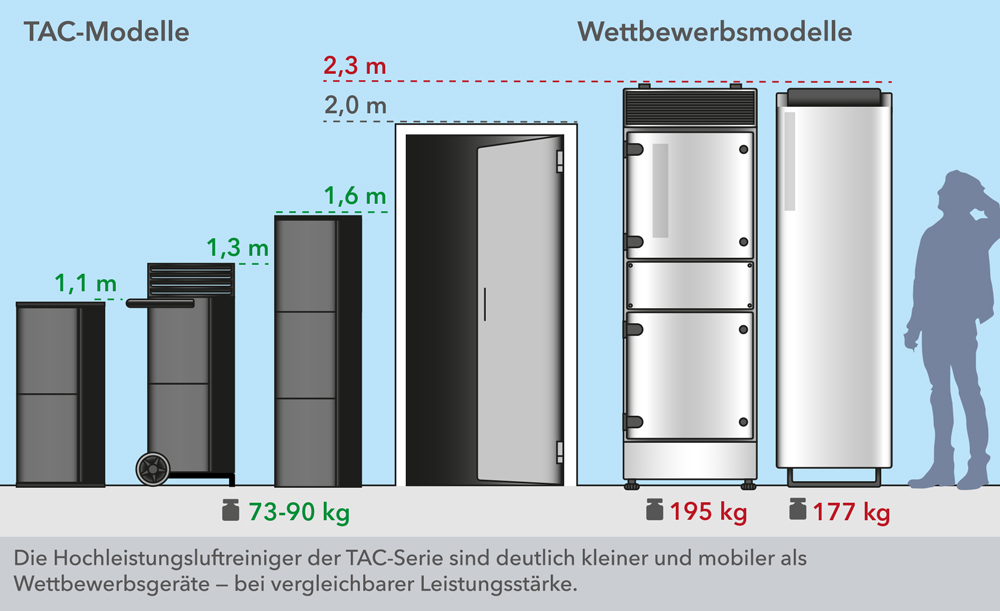 Mit der neuen Modellgeneration der TAC-Serie legen wir die Messlatte noch einmal höher und vergrößern das ohnehin breite Anwendungsspektrum unserer Hochleistungsluftreiniger.