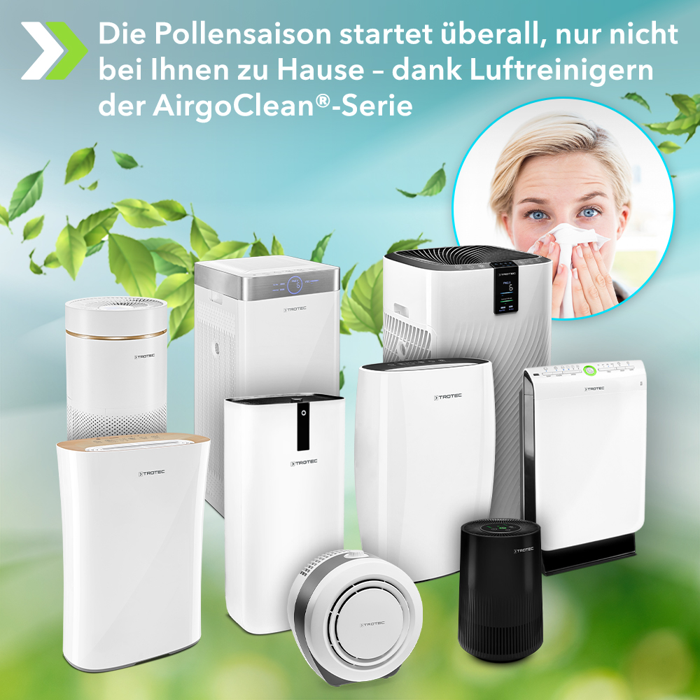 „Im Westen und Süden der Republik werden in den tiefen Lagen (…) verbreitet hohe Pollenbelastungen durch diese beiden Allergenträger Einzug halten“, heißt es in der Prognose der Stiftung Deutscher Polleninformationsdienst. Gut, dass sich draußen in Stadt und Land das Sorgen-Duo Allergie und Corona durch das Tragen einer FFP2- oder KN95-Maske weitgehend im Griff halten lässt. Und zu Hause oder im Büro? Hier sollten Sie auf die bewährten Luftreiniger der AirgoClean®-Serie von Trotec vertrauen, die zuverlässig die Belastung durch luftgetragene Viren, Bakterien, Allergene und Pollen sowie von Haus- und Feinstäuben reduzieren. Und übrigens auch unangenehme Gerüche entfernen. Dazu nutzen alle Luftreiniger der AirgoClean®-Serie modernste mehrstufige Filter-Technologien und verbessern die Raumluft dank ihrer hochwertigen HEPA-Filtertechnik.