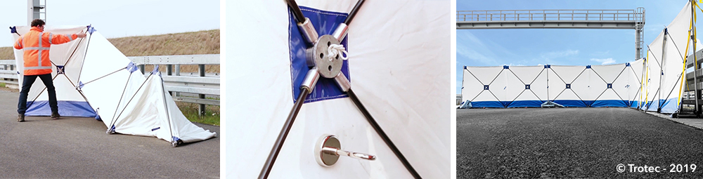 Traurig genug, dass dies in der heutigen Zeit eine notwendige Maßnahme ist, aber umso erfreulicher, dass Trotec eine effektive Lösung für dieses Problem hat: Die Trotec Standard-Sichtschutz-Wand VarioScreen ist 7 m lang, 1,80 m hoch und in der Länge mit zusätzlichen VarioScreens beliebig erweiterbar. Der besondere Pluspunkt: Die Wand lässt sich sekundenschnell von nur einer Person mit wenigen Handgriffen standfest aufstellen.
