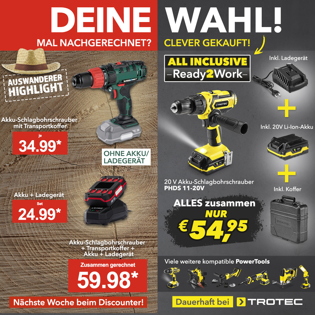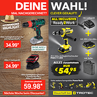 Beim Discounter gibt es nächste Woche einen Akku-Schlagbohrschrauber als Sonderangebot. Wenn man zusätzlich noch den Akku oder sogar auch ein Ladegerät mit dazu kaufen muss, ist der Discounter-Preis direkt teurer als bei Trotec.
