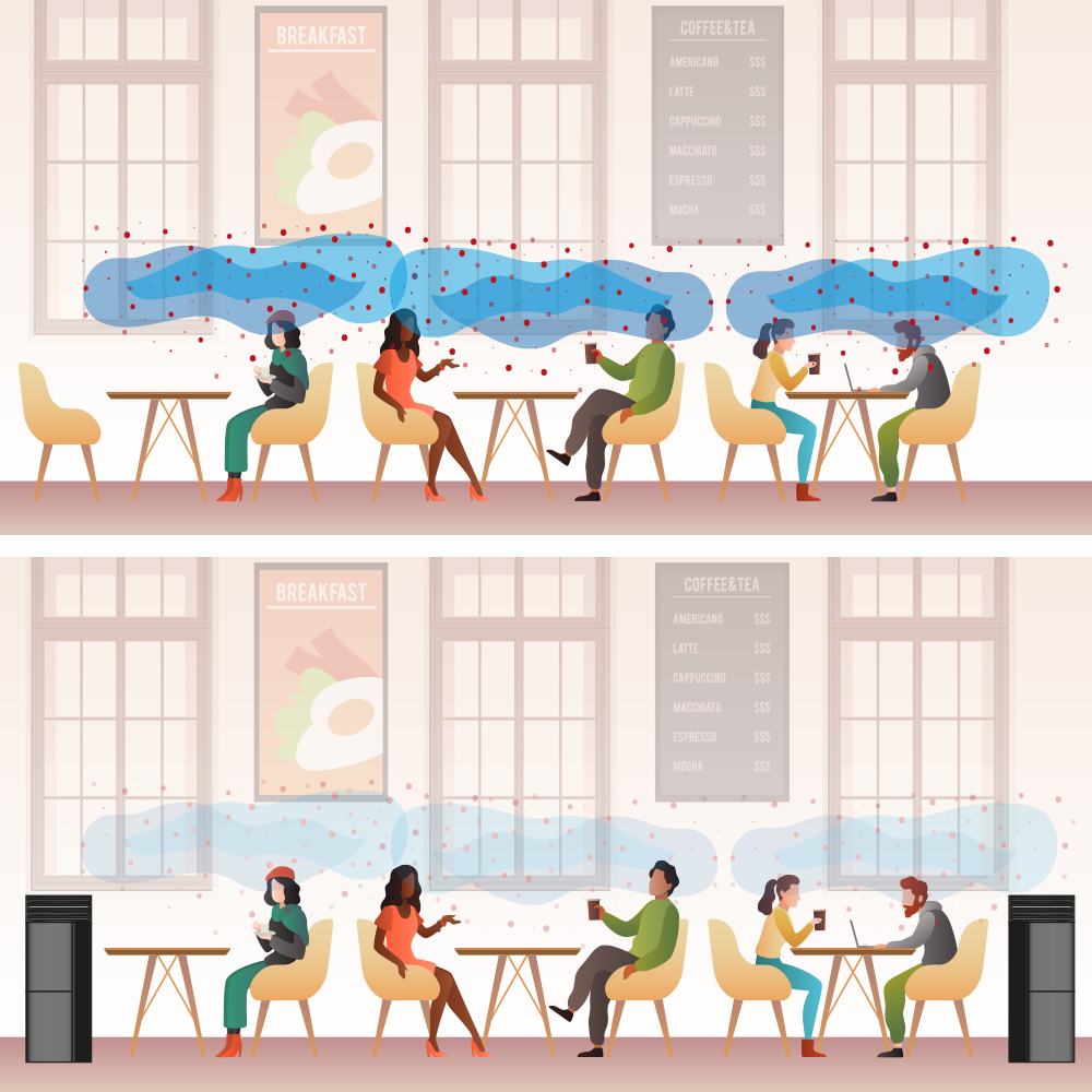 Das Tragen einer Mund-Nasen-Masken, beispielsweise beim Betreten eines Restaurants, schützt zwar zuverlässig vor größeren Tröpfchen, aber nicht vollends vor der Einatmung dieser winzig kleinen Aerosolpartikel. Daher lässt es sich während eines Restaurantbesuchs nahezu nicht vermeiden, das man während des Essens Luft einatmet, die zuvor von einer anderen Person im Raum ein- und wieder ausgeatmet wurde – und dadurch womöglich mit infektiösen Coronaviren belastet ist.
