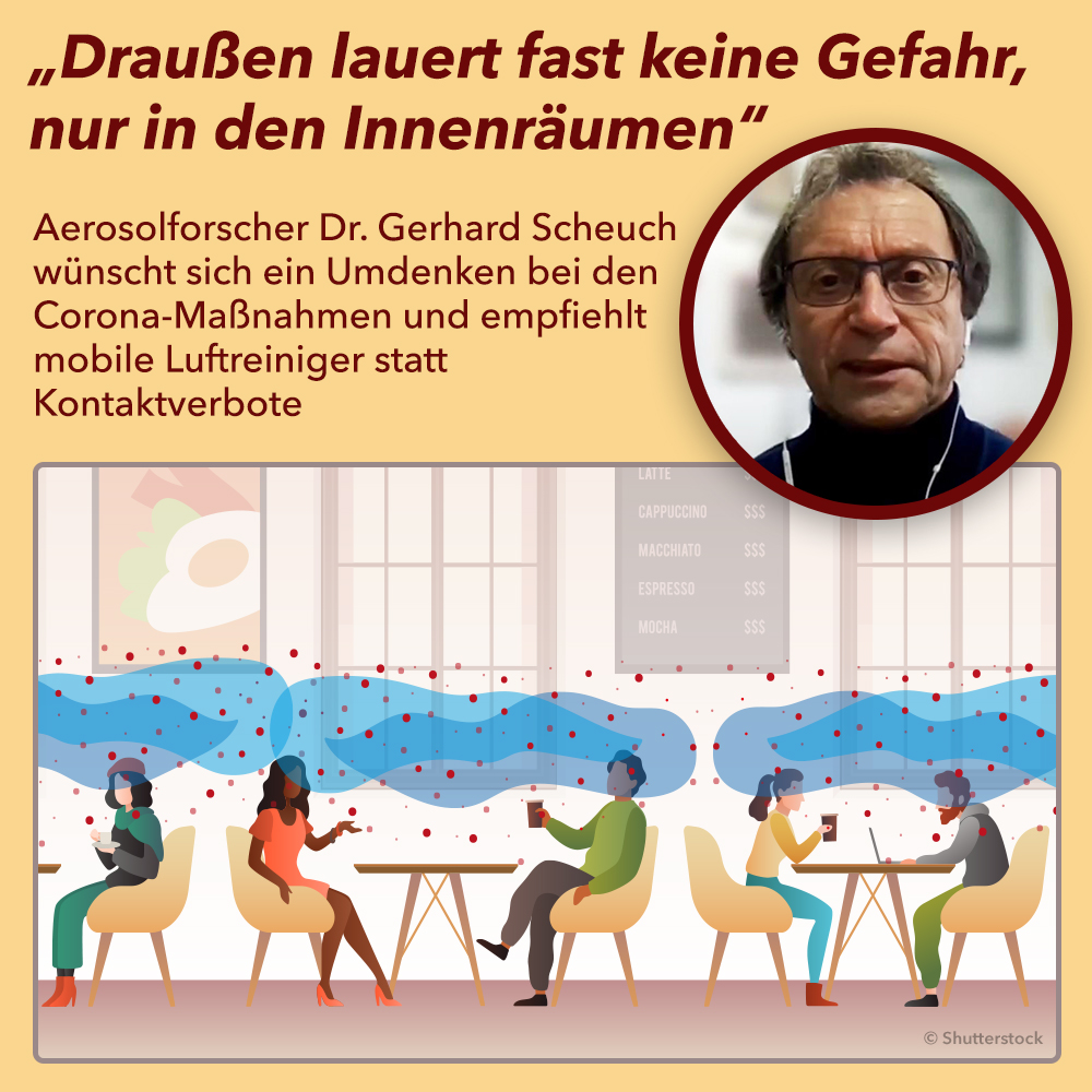 Im Interview verweist Scheuch auf ein Positionspapier der Gesellschaft für Aerosolforschung, in dem bereits im letzten Jahr wissenschaftlich fundiert dargelegt wurde, wie sich die Ansteckungsgefahr in Innenräumen senken lasse: „Es gibt sechs Punkte, die man beachten sollte. Erstens: Sich mit möglichst wenig Leuten treffen. Je mehr Menschen in einem Raum sind, desto höher wird die Wahrscheinlichkeit, sich anzustecken. Zweitens: Den Faktor Zeit berücksichtigen. Die doppelte Zeit in einem unbelüfteten Raum bedeutet fast vierfaches Ansteckungsrisiko. Treffen sollten so kurz wie möglich ausfallen. Drittens: Man braucht große Räume, viel Volumen um einen herum. In einer Kirche ist es ungefährlich, auch in Kinos oder in einem Theatersaal ist es wenig riskant. Viertens: Richtig und häufig lüften. Fünftens: Auch Raumluftfilter einsetzen, gerade da, wo Menschen lange zusammensitzen. Sechstens: Masken benutzen.“