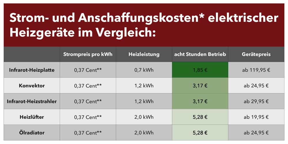 Stromverbrauch: Mit ihrer geringen Leistungsaufnahme bei gleichzeitig hoher Wärmeleistung sind die Infrarot-Heizplatten unter den elektrischen Heizgeräten die unangefochtenen Champions hinsichtlich der Energiebilanz. Um Wohn- oder Geschäftsräume mit einer 700 Watt starken Infrarot-Heizplatte acht Stunden am Tag warm zu halten, fallen 16 Kilowattstunden Strom zum aktuellen Durchschnittspreis von rund 33 Cent* an. Das Warmhalten eines Raumes kostet 1,85 Euro am Tag.