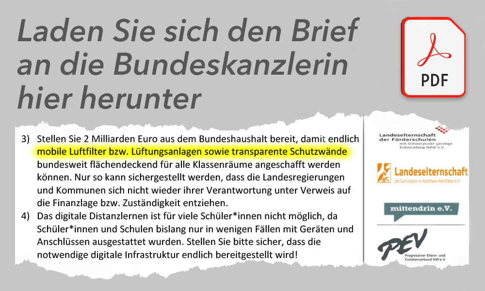 Mehr als 20 Elternverbände aus ganz Deutschland haben sich am 27. Januar 2021 in einem offenen Brief an Bundeskanzlerin Angela Merkel gewandt. Sie appellierten eindringlich an die Kanzlerin, den Schutzstandard in den Schulen durch den Einsatz von geeigneten Luftreinigern und Acrylglas-Trennwänden zu erhöhen, bevor die Kultusminister eine Rückkehr zum Präsenzunterricht beschließen. Zahlreiche Studien würden belegen, dass technische Infektionsschutz-Lösungen wie TAC V+ Hochleistungsluftreiniger und Acrylglas-Trennwände mit Aerosol-Schutzkante dem Sicherheitsniveau des manuellen Lüftungsverhaltens überlegen seien und durch den Einsatz dieser Geräte ein besserer Ansteckungsschutz in Schulen realisiert werden könne.