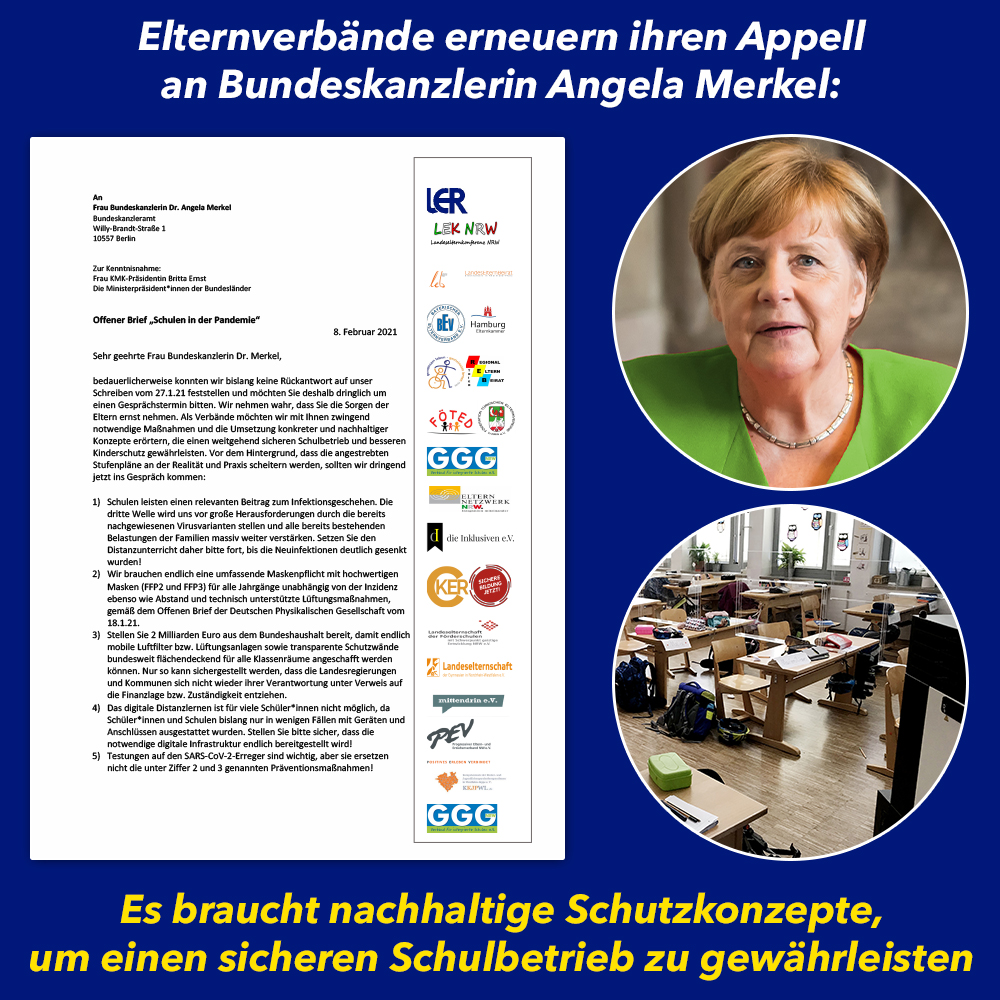 Geantwortet hat die Bundeskanzlerin auf diesen Brief nicht. Weder gab es eine direkte Antwort an die Initiatoren und Unterzeichner des Briefes, noch hat es eine Verlautbarung gegenüber der Presse hinsichtlich des Schreibens gegeben. Daher haben die Elternbände ihre eindringliche Bitte um einen Gesprächstermin am 08. Februar 2021 mit einem weiteren Brief an die Bundeskanzlerin erneuert.