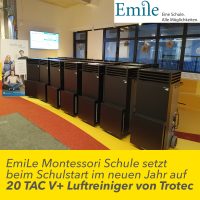 Ein schöneres Weihnachtsgeschenk hätten sich die Lehrerinnen und Lehrer der EmiLe Montessori Schule in München nicht wünschen können. Noch in den Weihnachtsferien wurden alle 20 Klassen- und Fachräume der EmiLe mit TAC V+ Luftreinigern von Trotec ausgestattet. Die explizit zur Ausfilterung virenbehafteter Aerosole in Innenräumen entwickelten Hochleistungsluftreiniger senken nachweislich das Ansteckungsrisiko in den Klassenzimmern. Darüber hinaus wird durch den Einsatz der Geräte insbesondere in den kalten Wintermonaten das problematische Lüften mit offenen Fenstern überflüssig.