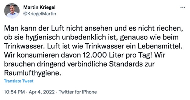Der Wissenschaftler Prof. Dr. Martin Kriegel vom Hermann-Rietschel-Institut der TU Berlin empfiehlt daher verstärkt Augenmerk auf eine wirksame Lufthygiene zu legen. Je weniger Personen in geschlossenen Räumen eine Maske tragen, desto höher ist die Gefahr einer Ansteckung mit dem Coronavirus. Gleichzeitig weist Kriegel auf ein weiteres Problem hin: Die Luft in Innenräumen ist in den seltensten Fällen „sauber“. Vielmehr ist sie in Büroumgebungen nicht selten mit Tonerstaub und anderen Schwebstoffen belastet. In Gebieten mit hohem Verkehrsaufkommen droht zudem die Gefahr hoher Feinstaubkonzentrationen, die von außen in die Raumluft gelangen. Durch den Wegfall der Maskenpflicht geraten nun auch diese luftgetragenen Risiken am Arbeitsplatz wieder stärker in den Fokus.