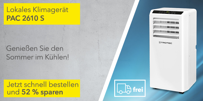 Profitieren Sie von der Trotec-Markenqualität als Garant für hohe Wertigkeit, Sicherheit und Funktionalität. Bestellen Sie deshalb am besten noch heute das Klimagerät PAC 2610 S zu unserem aktuellen Angebotspreis statt für 479,95 € für nur 229,95 € inkl. MwSt. – jetzt im Trotec-Shop!
