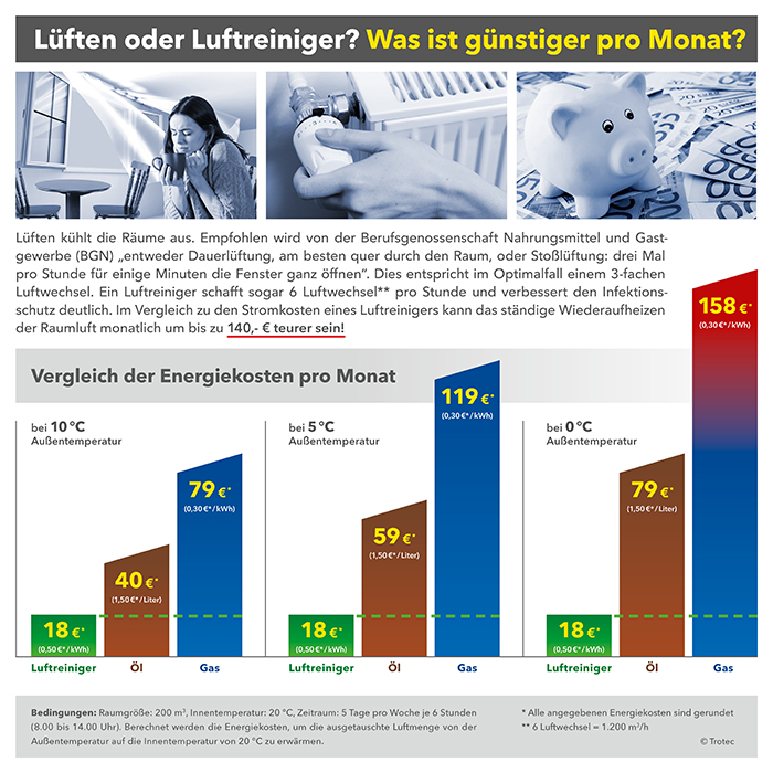 Moderne Luftreiniger von Trotec mildern die Auswirkungen dieser Heizkostenfalle bei gleichzeitigem Infektionsschutz deutlich ab.