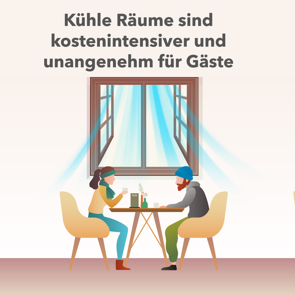 Die Berufsgenossenschaft Nahrungsmittel und Gastgewerbe (BGN) empfiehlt „entweder Dauerlüftung, am besten quer durch den Raum, oder Stoßlüftung: drei Mal pro Stunde für einige Minuten die Fenster ganz öffnen.“ Aber was dem Infektionsschutz dient, treibt vielen Gastronomen Sorgenfalten auf die Stirn: Derart gelüftete Räume kühlen sehr schnell aus, die Gäste fühlen sich unwohl – oder bleiben lieber direkt zu Hause. Auch mit Blick auf die explodierenden Energiekosten wird das Lüften in diesem Winter eine Herausforderung. Durch Lüften ausgekühlte Gasträume müssen umso kostenintensiver wieder beheizt werden. Das treibt die ohnehin massiven Energiekosten weiter in die Höhe.