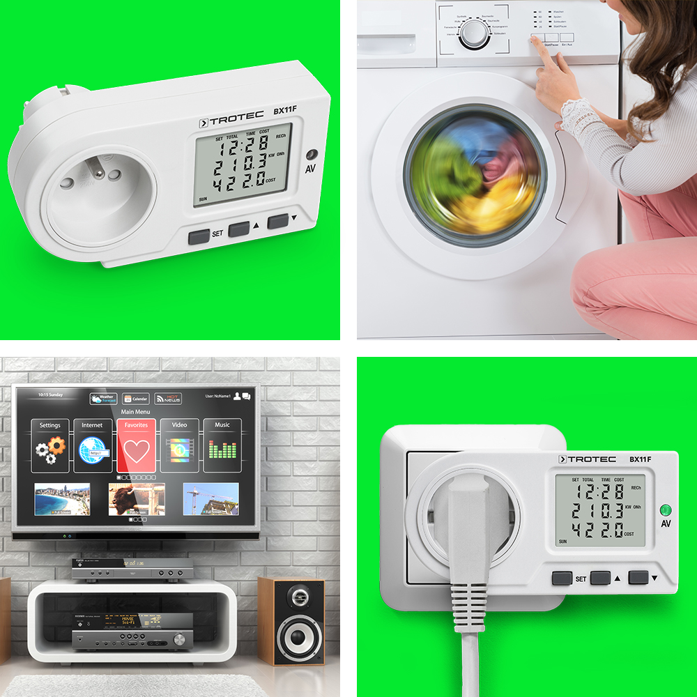 Das kompakte Energiemessgerät BX11F wird einfach zwischen den elektrischen Verbraucher und die Steckdose gesetzt ¬– und schon misst es absolut präzise die durchfließende Energie. Der Stromverbrauch wird gut ablesbar in Watt und sogar direkt in Euro und Cent auf dem großen LCD-Display angezeigt. Dafür muss nur der eigene Strompreis im Messgerät gespeichert werden. Dann sieht man auf einen Blick, wieviel Strom ein Gerät pro Tag verbraucht und wieviel einen der Betrieb unterm Strich kostet.