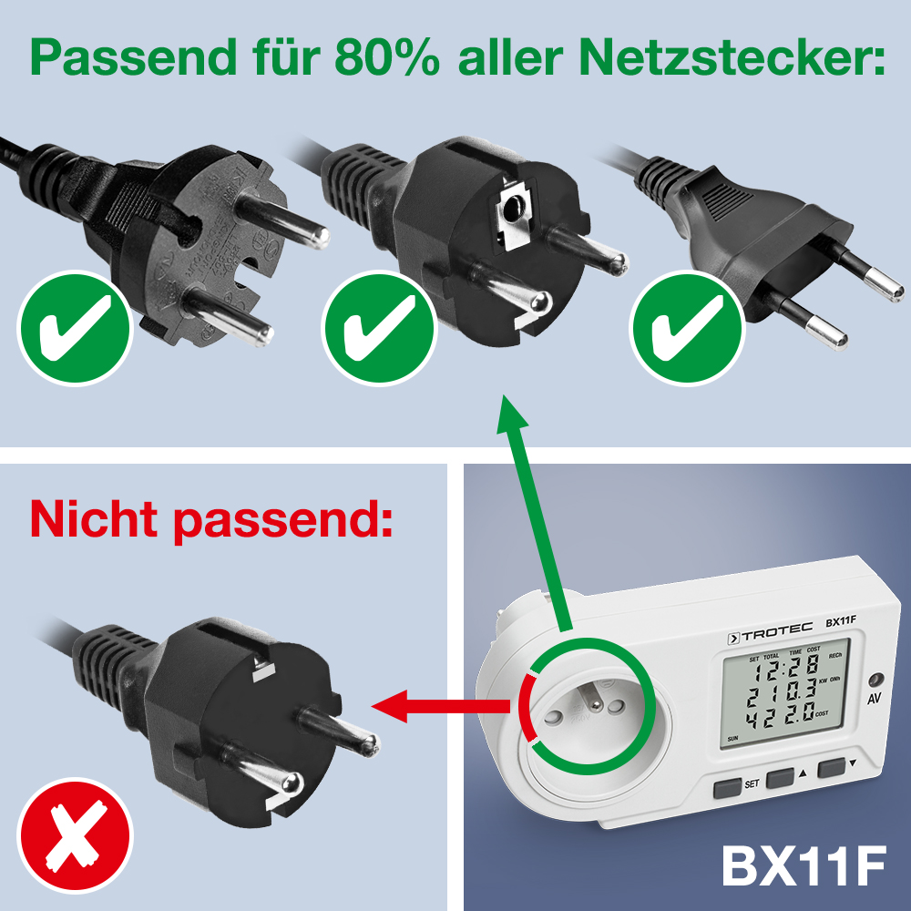 Das Energiekostenmessgerät BX11F kann in Verbindung mit handelsüblichen Eurosteckern, Konturensteckern und vielen auch ausländischen Schukosteckern (CEE 7/7) verwendet werden.