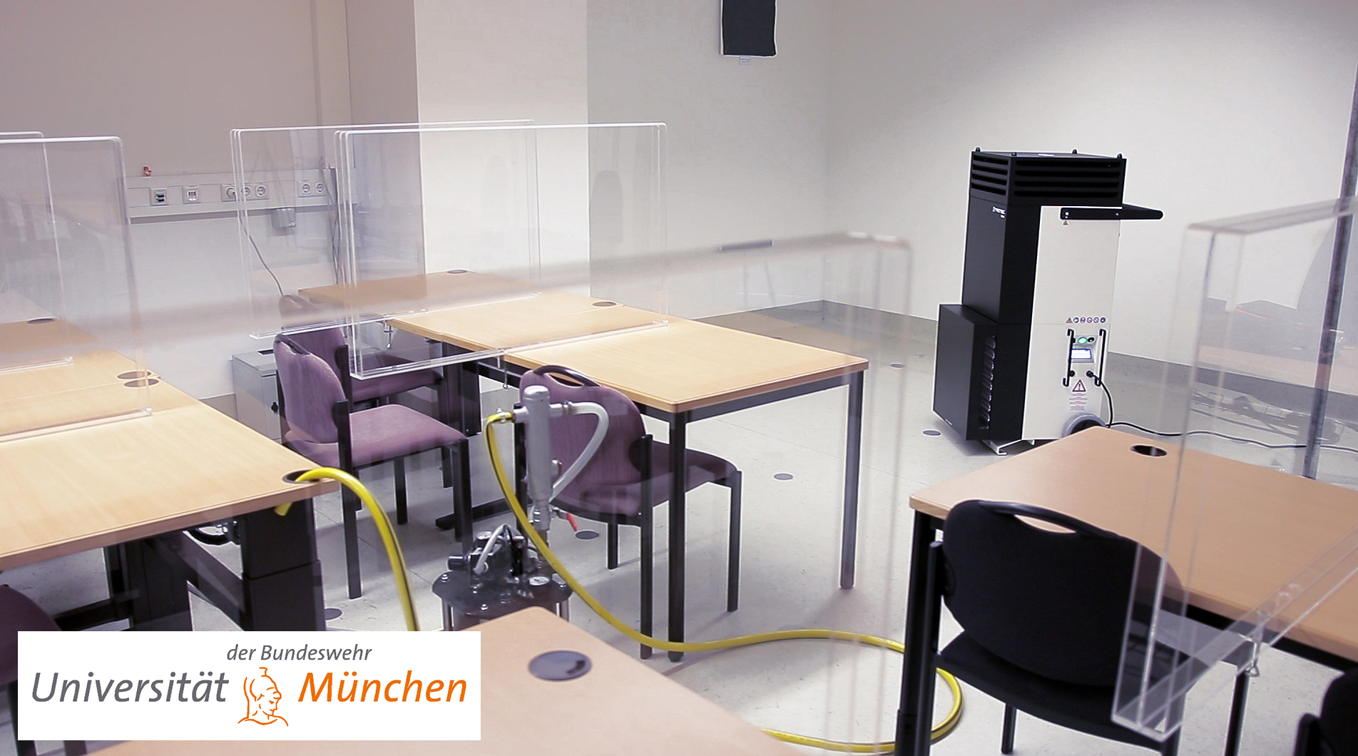Einer dieser Wissenschaftler ist Prof. Dr. Christian Kähler, der an der Universität der Bundeswehr das Institut für Strömungsforschung und Aerodynamik leitet. Der international anerkannte Aerosolexperte ist in der aktuellen Pandemie ein gefragter Ratgeber, denn Kähler erforscht mit seinem Team, wie sich Aerosole in geschlossenen Räumen ausbreiten und wie man Aerosolkonzentrationen im Raum mittels technischer Lösungen möglichst wirksam reduzieren kann. Für den durchschnittlichen Bürger ein eher trockenes Thema, das aufgrund der aktuellen Erkenntnisse zur Übertragungsweise des SARS-CoV-2-Virus jedoch immens an Bedeutung gewonnen hat. Denn während man zu Beginn der Pandemie noch davon ausging, dass sich das Coronavirus hauptsächlich über Tröpfchen verbreitet, gilt nun als wissenschaftlich bewiesen, dass winzig kleine virenbehaftete Aerosole in der Luft den Covid-19-Erreger in sich tragen. Produziert werden diese virenbehafteten Aerosole in der Lunge von erkrankten Personen und vorwiegend beim Atmen wie auch beim Sprechen in den Raum freigesetzt. Während größere Tröpfchen aufgrund ihres Gewichts bereits nach ca. 1,5 Metern zu Boden sinken, schweben die leichten Aerosolteilchen aufgrund ihrer geringen Größe (ca. 0,1-0,3 µm) mehrere Stunden in der Raumluft, breiten sich aus und werden selbst viele Meter entfernt unbemerkt eingeatmet. Selbst mit herkömmlicher Mund-Nasen-Maske, sofern es sich nicht um eine partikelfiltrierende Maske des Typs FFP2 oder FFP3 handelt.