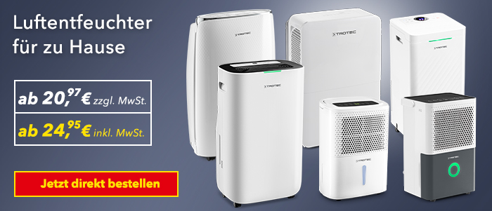 Trotec-Luftentfeuchter entziehen der Raumluft überschüssige Feuchtigkeit und sorgen so für ein konstant trockenes Raumklima im optimalen Bereich. Ausgestattet mit einer hygrostatgesteuerten Entfeuchtungsautomatik schalten sich die Entfeuchtungsgeräte automatisch an, sobald die Luftfeuchtigkeit in einem Raum zu hoch ist und ebenso automatisch wieder ab, wenn der gewünschte Luftfeuchtigkeitswert erreicht ist. Dabei verbrauchen die Geräte zumeist nur sehr wenig Strom. Kleinere Geräte wie die Peltier-Luftentfeuchter TTP 1 E und TTP 2 E verbrauchen gerade einmal 20 Wattstunden Strom, was in etwa dem Verbrauch einer Energiesparlampe entspricht.